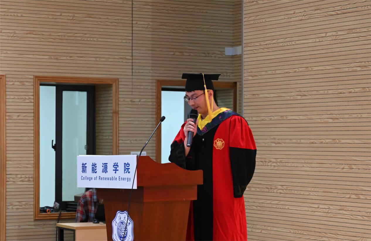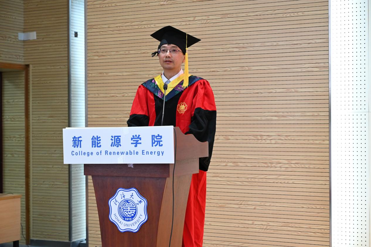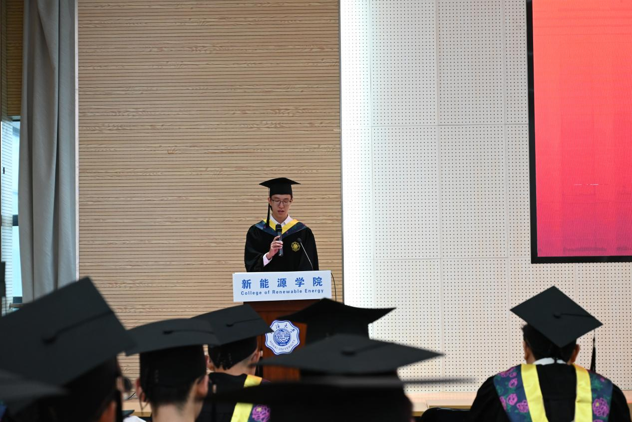 教师代表马远卓为毕业生寄语。马老师表示:“新能源行业是一个充满潜力、创新和挑战的领域,希望年轻的同学们能够以崭新的视野和胸怀,积极投身到新能源事业发展中。期待大家继续秉承河海校训,坚定艰苦朴素、实事求是的精神,严格要求自己,勇于探索新的天地。”