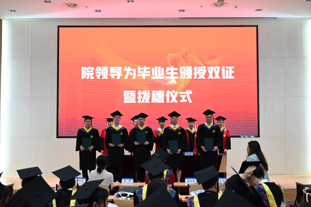 院领导为毕业生颁发证书暨拨穗仪式。学院领导们逐一为毕业生拨穗并颁发毕业证书、学位证书。在这个庄严的时刻,毕业生们脸上洋溢着幸福的笑容,他们向领导们鞠躬致谢,表达了对母校的感激之情。