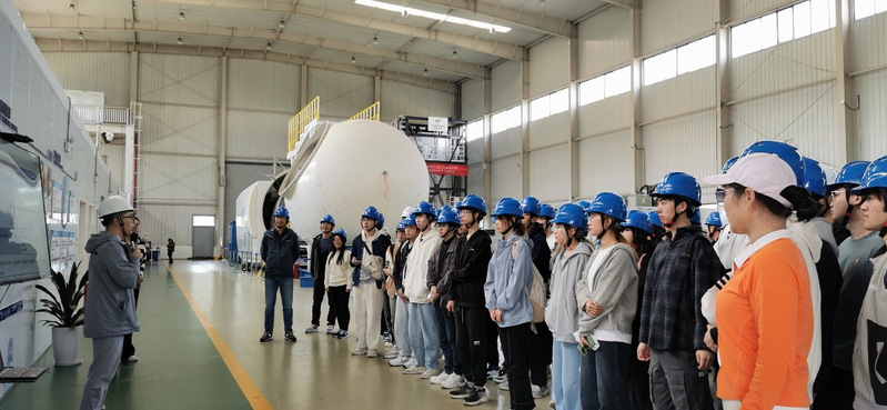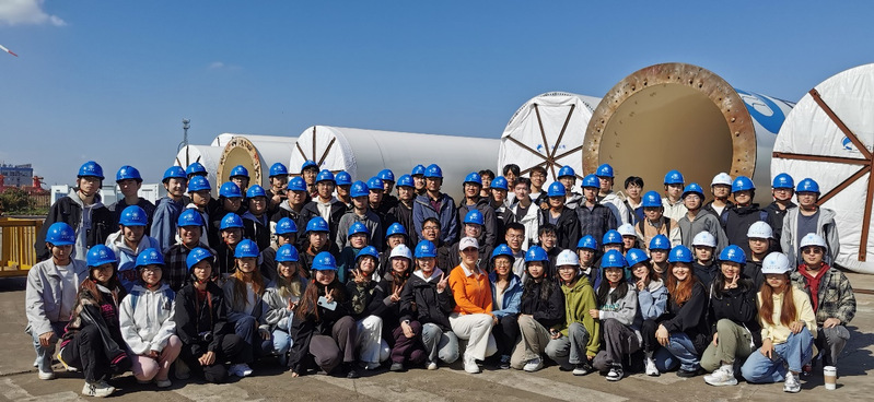 实习的第三站是江苏海恒风电设备制造有限公司的实习基地。在这里,专业技术人员详细讲解了塔筒的选型、生产制造及现场安装等多个流程。通过实例分析,阐述了不同类型塔筒的设计考虑因素,包括风荷载、地质条件及材料选择等,帮助学生们理解了塔筒在风电机组中的重要性。学生们参观了塔筒的生产线,直观感受到塔筒内部结构及塔架基础的复杂性与重要性。通过亲自接触和观察,学生们深刻认识到塔筒不仅是风电机组的支撑结构,更在风能转化效率和安全性方面起着至关重要的作用。现场的讨论与提问氛围热烈,学生们积极参与,踊跃向专业技术人员请教,表现出对专业知识的强烈渴求。技术人员耐心解答了学生们关于塔筒设计、施工工艺以及运维管理等方面的问题,进一步加深了学生们对风电塔筒技术的理解。