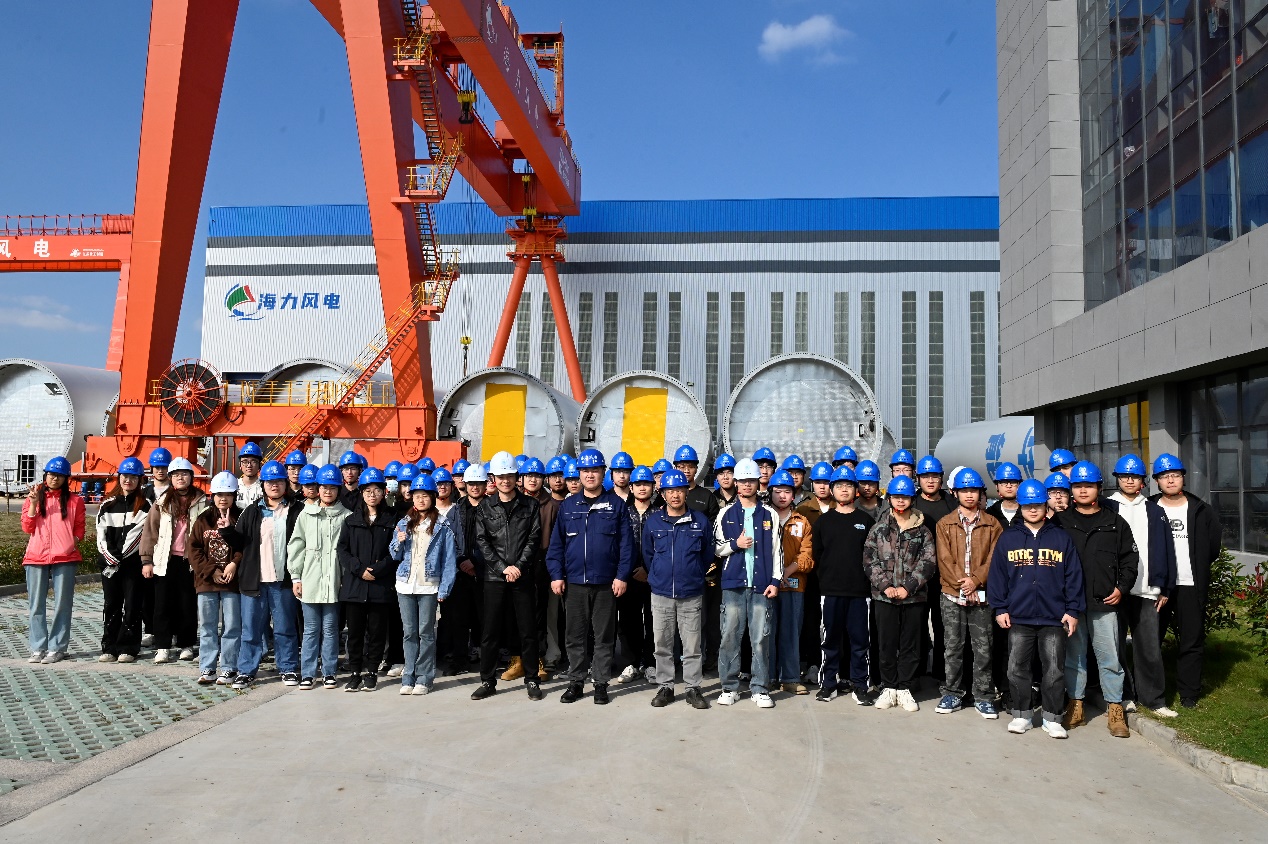 在九鼎风电和海力风能设备制造企业,全面学习10MW级风电叶片和塔筒生产的各环节。首先,参观叶片制造产线,从材料选择、模具准备、树脂注入、固化成型、后处理等步骤了解生产工艺。在材料选择上,主要采用轻质高强度的玻璃纤维或碳纤维复合材料,以确保叶片的强度和刚度;模具准备阶段,需要精确设计和制造模具,以保证叶片的外形和尺寸精度;后处理包括切割、打磨、喷漆等工序,以提高叶片的外观质量和表面保护性能。此外,还需要进行严格尺寸检测、力学性能测试和耐久性测试等质量检测。在塔筒制造方面,主要工艺包括钢板切割、卷制、焊接、防腐处理等环节。防腐处理是延长塔筒使用寿命的关键,通常采用喷涂防锈漆和热镀锌等方式。通过参观与交流,进一步加深了学生们对风电设备加工技术的理解。