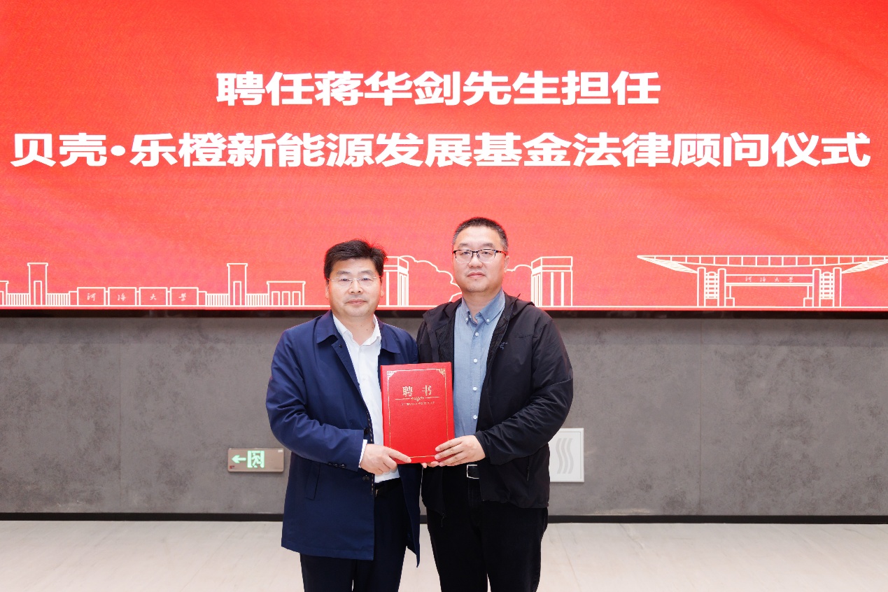 接着,3044永利集团国内合作处处长、基金办主任赵冰与贝壳·乐橙新能源发展基金秘书长张春莉,共同签署贝壳·乐橙新能源发展基金捐赠协议。学院副院长程亚军为张春莉秘书长颁发捐赠证书。会议还聘请蒋华剑担任贝壳•乐橙新能源发展基金法律顾问,由学院党委书记杨春伟为蒋华剑颁发聘书。